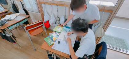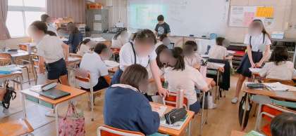算数の分割学習の様子です。分数の掛け算の練習問題を繰り返し学習していました。教え合いも活発に行ないながら進めていました。
