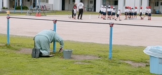 本校運動場には、綺麗な芝生が植っていて子どもたちのいい遊び場になっています。管理作業員さんが芝生の手入れをしてくれていますが、とても大変です。今日も雑草を丁寧に抜いていました。いつも,ありがとうございます。