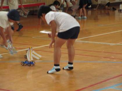 3年生が理科「風とゴムのはたらき」で製作した帆かけ車がずらりと並んでいます。