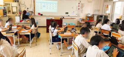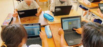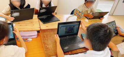 図工の学習です。タブレット端末で机の上を撮影して、そこに描画機能を使ってデザイン画を描いていました。