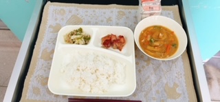 今日の献立は,鶏肉の醤油バター焼き、味噌汁、野菜炒め、ご飯、牛乳です。みんなで協力して配膳して、いただきます。
