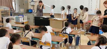 国語の時間に伝言ゲームをしていました。相手の話をよく聞くこと、聞いた話を正確に伝えることなどの学習です。
