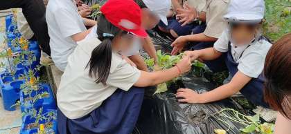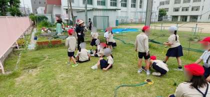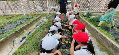 生活科の学習です サツマイモを育てます。班に分かれて学習園にツルを植えました。秋にはたくさんのお芋ができるといいですね♪