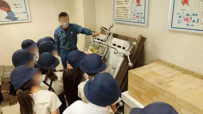 西淀工場に着き、見学を開始しています。工場の方々からの説明をしっかり聴きながら見学しています。