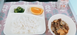今日の献立は、すき焼き煮、キュウリの生姜漬け、オレンジ、ご飯、牛乳です。いただきます。