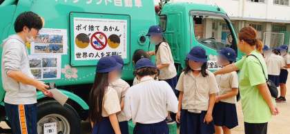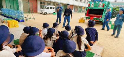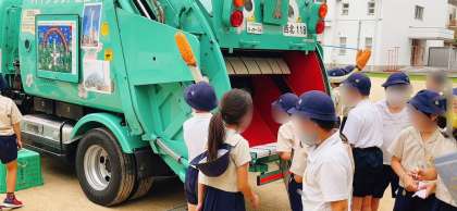 4年生が出前授業を受けています。此花区環境事業局の方々が来て廃棄物処理についての学習です。廃棄物回収についての話を聞いた後、パッカー車クイズに挑戦しています。パッカー車の車体に貼ってある問題を探して答えを考えます。