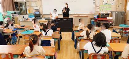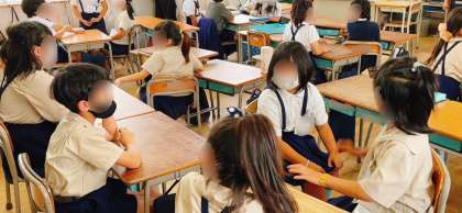 英語活動の時間でした。家の中の部屋の名前(台所や寝室など)を英語で知る学習でした。クイズ形式で、答えを英語で言いました。班で相談しながら進めていました。