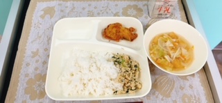 今日の献立は、白身魚のフリッター、すまし汁、鶏菜っぱ炒め、ご飯、牛乳です。いただきます。