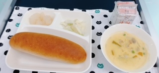 今日の献立は,かぼちゃのクリームシチュー、キャベツの柚子ドレッシング、和梨(缶)、黒糖パン、牛乳です。いただきます。