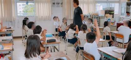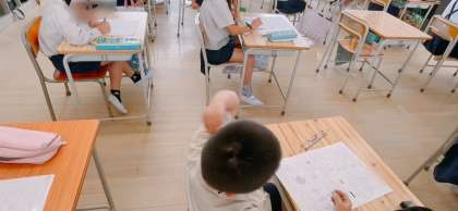 上段は1組、理科のテストに取り組んでいました。下段は2組、社会科で大阪の川や台地などの名前クイズをしていました。