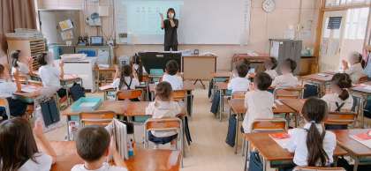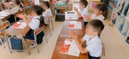 国語の学習です。「おじいさん」や「おばあさん」などひらがなで表記しているけど発語する時は「おじーさん」、「おばーさん」など伸ばす言葉について学習していました。手拍子をしたり手を上から下へスライドしたりしてしっかり発音するところと伸ばすところの違いを動作で確認していました。