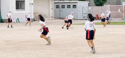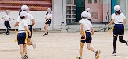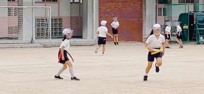 体育の学習で、しっぽ取り鬼をしていました。運動場いっぱい使って走り回っていました。