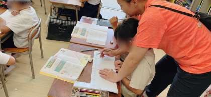算数の学習です。できるだけ複数で指導できる体制をとっています。苦戦している子に対しては、すぐ横に行ってアドバイスを送っています。