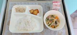 今日の献立は、中華煮、厚揚げのピリ辛醤油かけ、もやしの中華和え、ご飯、牛乳です。いただきます。