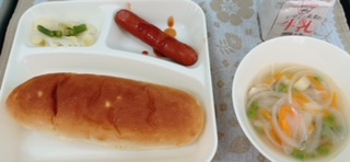 今日の献立は、ウィンナーのケチャップソース、スープ、キャベツと三度豆のサラダ、おさつパン、牛乳です。いただきます。