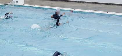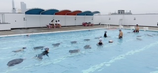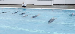 プール水泳学習の様子です。だるま浮きやけのび、バタ足など基本的な水慣れをどんどんこなしていきクロールの練習に入りました。