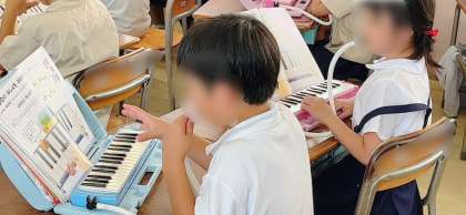 音楽の学習です。みんなでリズム歌あそびをした後、鍵盤ハーモニカの練習を頑張っていました。