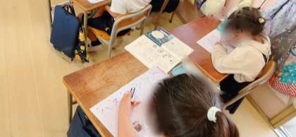 国語でカタカナの学習です。「ス」や「マ」の練習をしていました。「ス」や「マ」のついた言葉を発表した後それぞれの文字を練習しました。