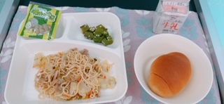 和風焼きそば、オクラの甘酢和え、抹茶大豆、1/2黒糖パン、牛乳でした。ごちそうさまでした。