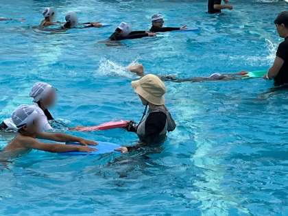プール水泳学習の時は、バディシステムを組んでいます。前後や横など2〜3人の小グループで、互いの顔色や様子などを確認し合います。指導者は水から上がると常にバディの確認を指示しています。