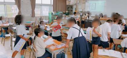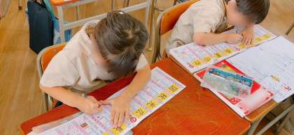 国語の学習で、新出漢字の練習をしていました。止め、はね、はらいなどキチンとできているか先生にチェックしてもらうために長い列ができていました。