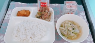 今日の献立は、ゴーヤチャンプルー、五目汁、厚揚げの生姜醤油かけ、ご飯、牛乳です。いただきます。