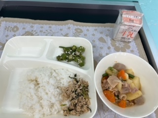 今日の献立は、豚肉とじゃがいもの煮物、オクラの梅風味、ツナっ葉炒め、ご飯、牛乳です。いただきます。