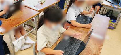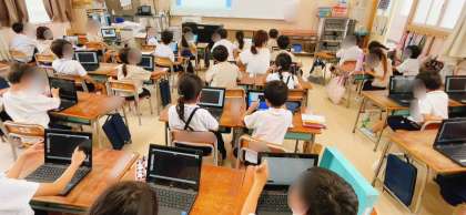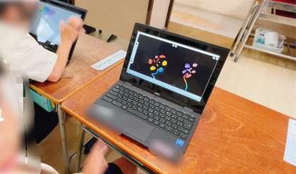 図工の学習です。先日からの引き続きでタブレット端末を使った作品作りです。色彩豊かに塗った画面の上に黒い画面を重ね、その黒を消しゴムで消していって花火を表現していました。きれいな花火が夜空に浮かび上がっていました。