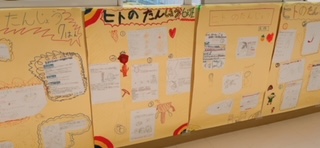 5年生の教室前に掲示してある壁新聞です。理科の「ヒトのたんじょう」について学習したことをまとめています。各班、趣向を凝らしています。