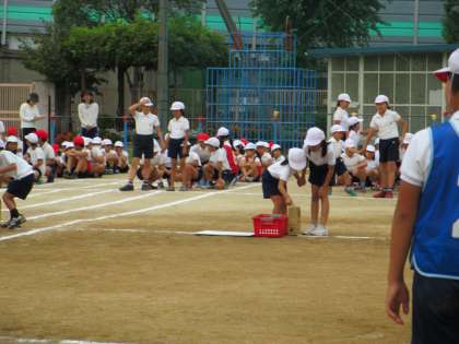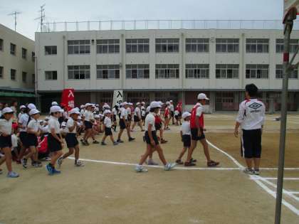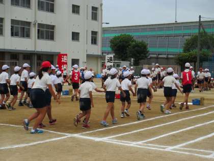 今日の運動会全体練習は、たてわり班で取り組む、「お絵かきリレー」の練習です。
