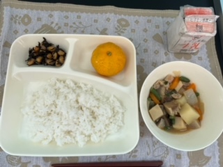 今日の献立は、鶏肉と野菜の煮物、ひじき豆、冷凍みかん、ご飯、牛乳です。いただきます。