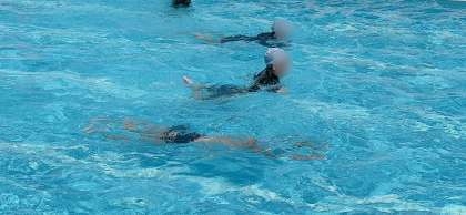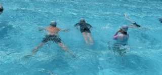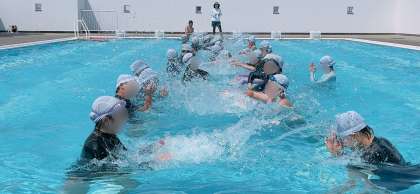 プール水泳学習の様子です。平泳ぎの練習をしています。平泳ぎは足の動かし方や手と足のかきのタイミングが難しい泳法です。これからしっかり練習していきます。