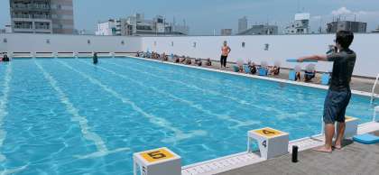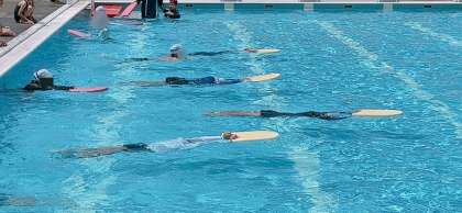 プール水泳学習の様子です。今日はビート板を使ってけのびの練習をしました。写真は2年生です。とてもきれいに伸びていますね。