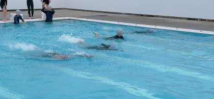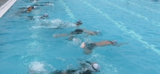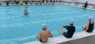 プール水泳学習の様子です。平泳ぎの練習をしていました。手のかき方、足のかき方、まずは陸上で確認してみてから泳いでいました。なかなか上手くはいかないようです。