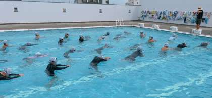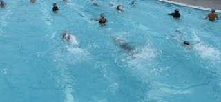 プール水泳学習です。クロールの手の動きを水慣れの運動に取り入れています。実際に距離を泳ぐ時に役立ちます。