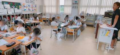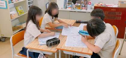 国語の学習で、プリント学習をしていました。班で相談や教え合いなどをしながら取り組んでいました。