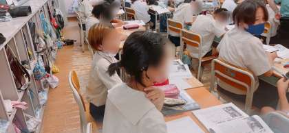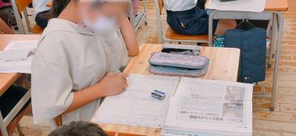 国語で、二つの新聞記事を比べてそれぞれの意図を読み取る学習です。ワークシートに沿ってそれぞれの記事の内容をまとめていました。