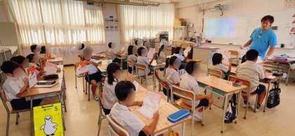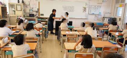下段は2組、配布物を配り説明をしていました。「この後、席替えしようか。」って先生の一言に子どもたちがわいていました。