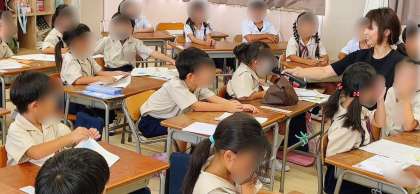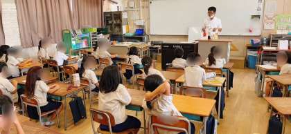 上段は1年1組、宿題で描いてきた絵日記の紹介で、先生にインタビューされていました。「スパプーに行きました。」って話していました。