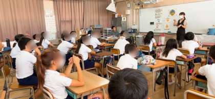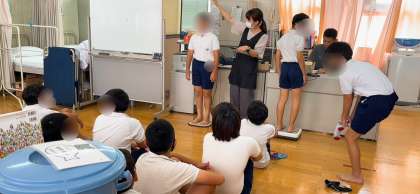 学期始めの身体測定の時間でした。養護教諭の保健指導を受けてから身長と体重を計っていました。