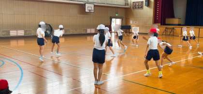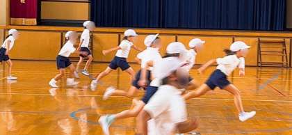 体育の学習です。単に走るんではなく、スキップや横向き走り、大股走りなど普段とは違う身体の使い方をすることで、身体をうまく扱う力を養います。