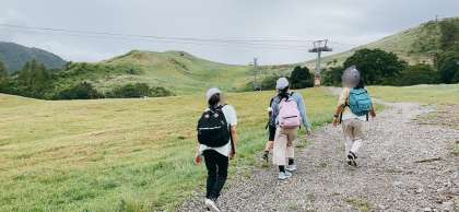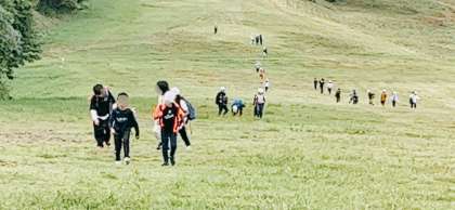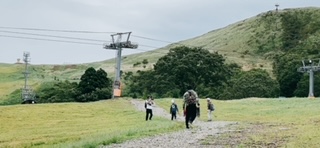小雨の中、オリエンテーリングが始まりました。高丸山の頂上目指して班で頑張りましょう!