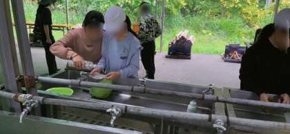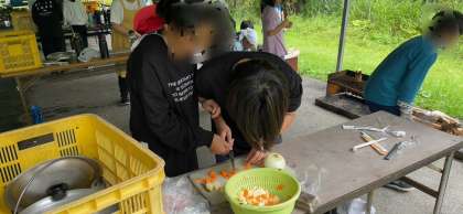 現地での最後の食事、飯盒炊爨が始まってます。食材を切る係、火を起こす係、そして使ったしりから洗って片付ける係、めいめいが同時進行です。