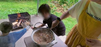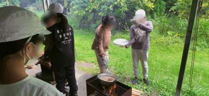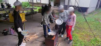ぐつぐつごとごとカレーが出来てきました。子どもたちは煙による目の痛さを堪えながら鍋の中を混ぜたり、具材の硬さを確認したり、頑張ってました。