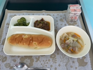 今日の献立は、おさつパン、牛肉のデミグラスソースに、スープ、きゅうりのピクルス、牛乳でした。美味しくいただきました。ごちそうさまでした。