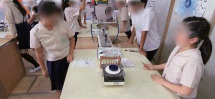 理科で、水溶液の性質について学習していました。いろいろな水溶液を熱して蒸発させていました。