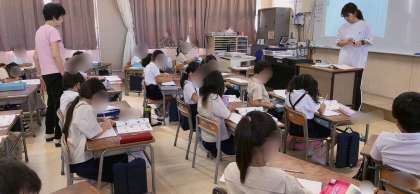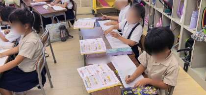 算数の学習で、10+いくつの計算の練習をしていました。白板に書かれた問題を解いたあとは、自分で問題を作って練習していました。