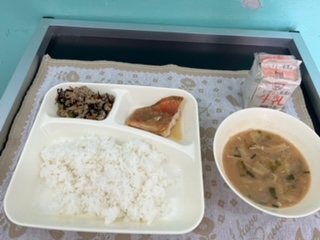 今日の献立は、赤魚のおろし醤油かけ、味噌汁、高野豆腐の炒り煮、ご飯、牛乳です。いただきます。