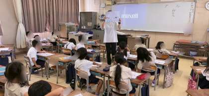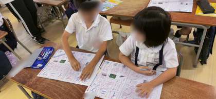 国語で、カタカナの学習です。いつも丁寧に取り組んでいる子のノートを先生がみんなに見せ、ほめていました。子どもたちは、次こそは自分が紹介してもらえるよう集中力をグッとアップさせて練習していました。