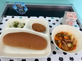 今日の献立は、チキンレバーカツ、ケチャップ煮、グリーンアスパラガスとキャベツのサラダ、黒糖パン、牛乳です。おいしそうですね、いただきます。
